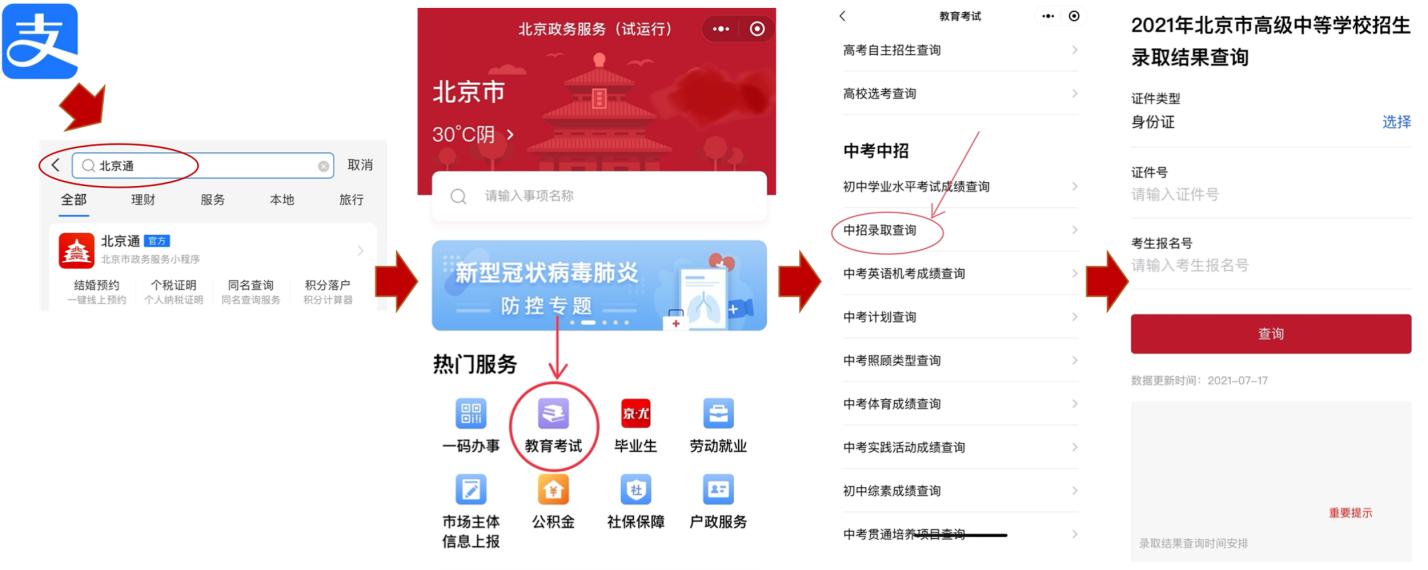 北京市2021年中招录取结果于7月18日开放查询入口,为方便考生和家长即时查询,市政务服务管理局会同市教育考试院,在北京市政务服务网、“北京通”APP和微信、支付宝、百度3个移动端“北京通”小程序等多种渠道提供了查询入口。