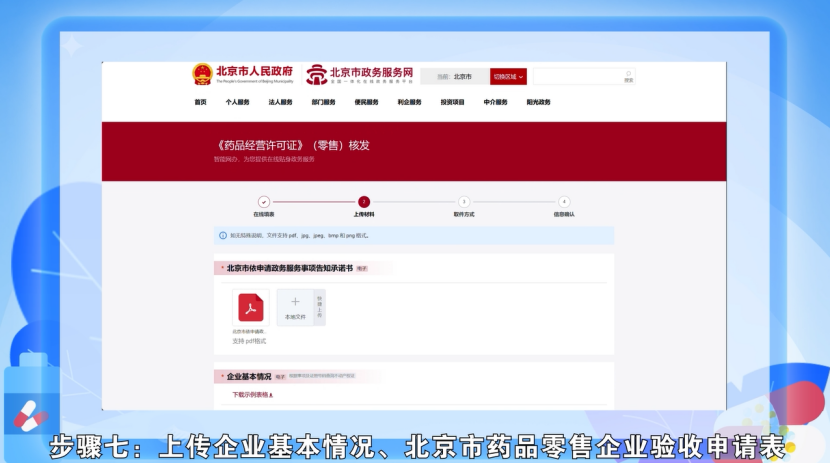 步骤七:上传企业基本情况、北京市药品零售企业验收申请表、人员基本情况等材料,点击“下一步”。