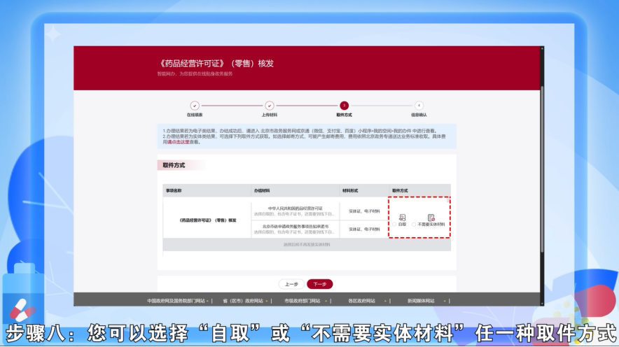 步骤八:您可以选择“自取”或“不需要实体材料”任一种取件方式,确定后,点击“下一步”。