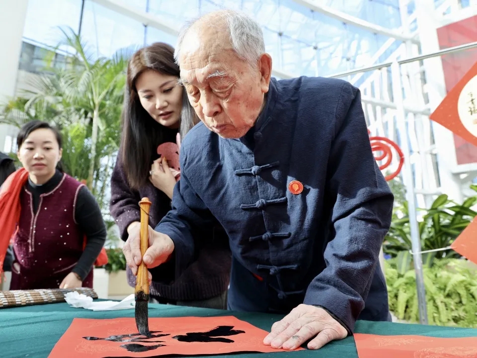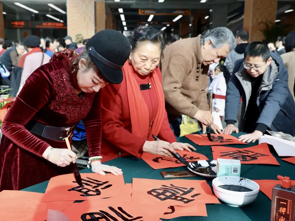 “非常高兴能参加这次活动。”年近九旬的著名书画家赵家玺一边挥毫书“福”字,一边笑着说道,“看到现场热热闹闹的场景,能够把新春的祝福和浓浓的年味通过笔墨送给大家,我感觉特别有意义。”