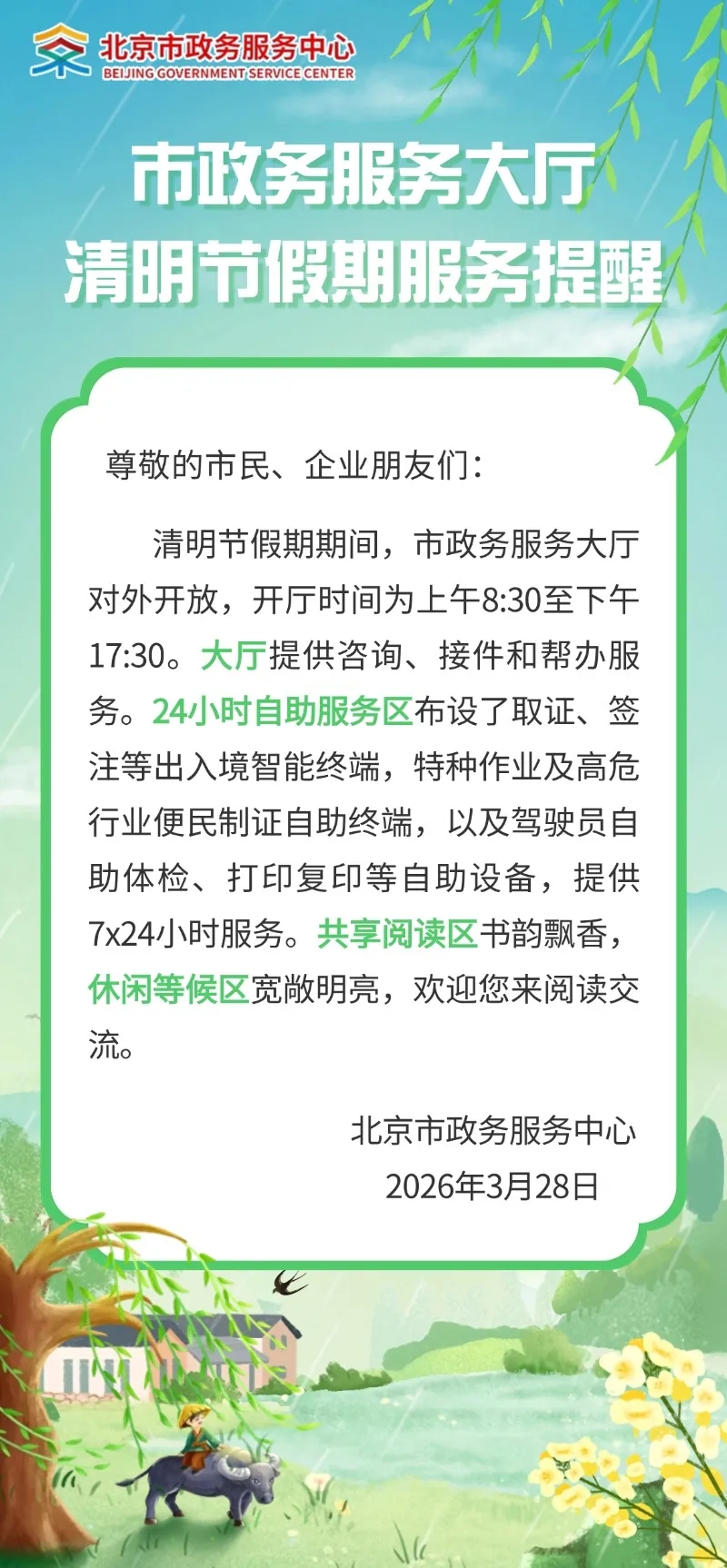 市政务服务大厅清明节假期服务提醒