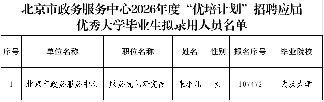 根据北京市2026年度“优培计划”招聘应届优秀大学毕业生工作有关要求,经笔试、面试、体检、考察等程序,确定朱小凡同志为北京市政务服务中心拟录用人员(名单附后),现予以公示,公示期为7个工作日。公示期间,如对拟录用人员有异议,请向北京市政务服务和数据管理局人事处反映。